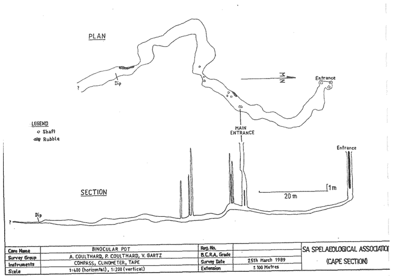 The name “Binocular Pot" is perhaps a misnomer because although the main entrance consists of two parallel shafts, there are also a number of other entrances to that cave. “Polynocular Pot" might be a better name for the cave which is situated on the De Hoop Nature Reserve near Cape Agulhas. The dense fynbos makes it difficult to locate the cave entrances, one of which is occupied by a beehive. Caution therefore has to be exercised when visiting the cave.