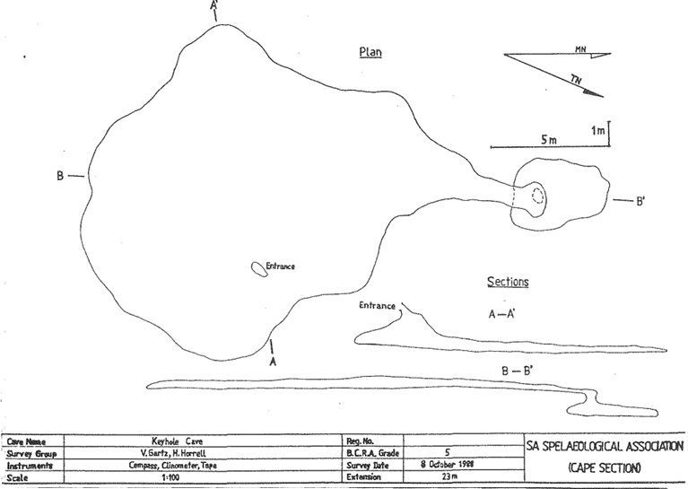 The cave was surveyed in October 1988 by Hamish Horrell and myself; and for the better part of two hours we battled to get from that narrow passage through the hole and into the lower chamber. The first approach was sliding into the passage feet first and on the belly. This was not successful so then we decided to slide in on the back, feet first. This resulted in the “back-breaker" position and it did not get us anywhere either. The next option was head first (which had been my idea) and so there I was, hanging upside down with my head inside the little chamber but not being able to get into the chamber any further due to the awkward geometry of the passage and the hole. "Hamish, I think my shoulders are too wide, I can’t fit through.”